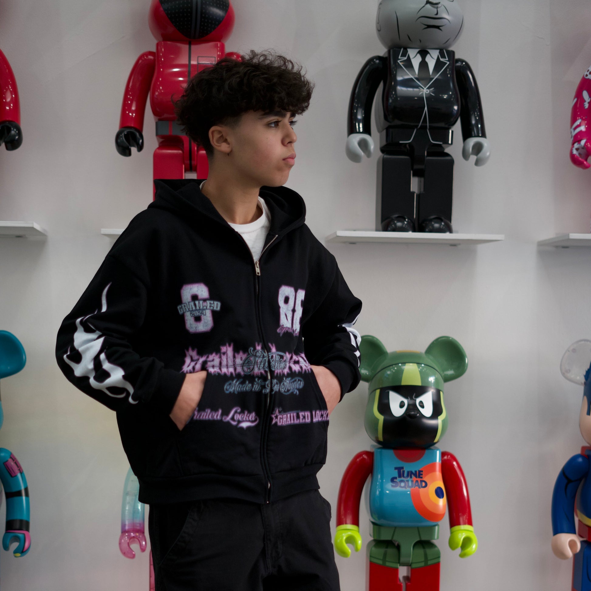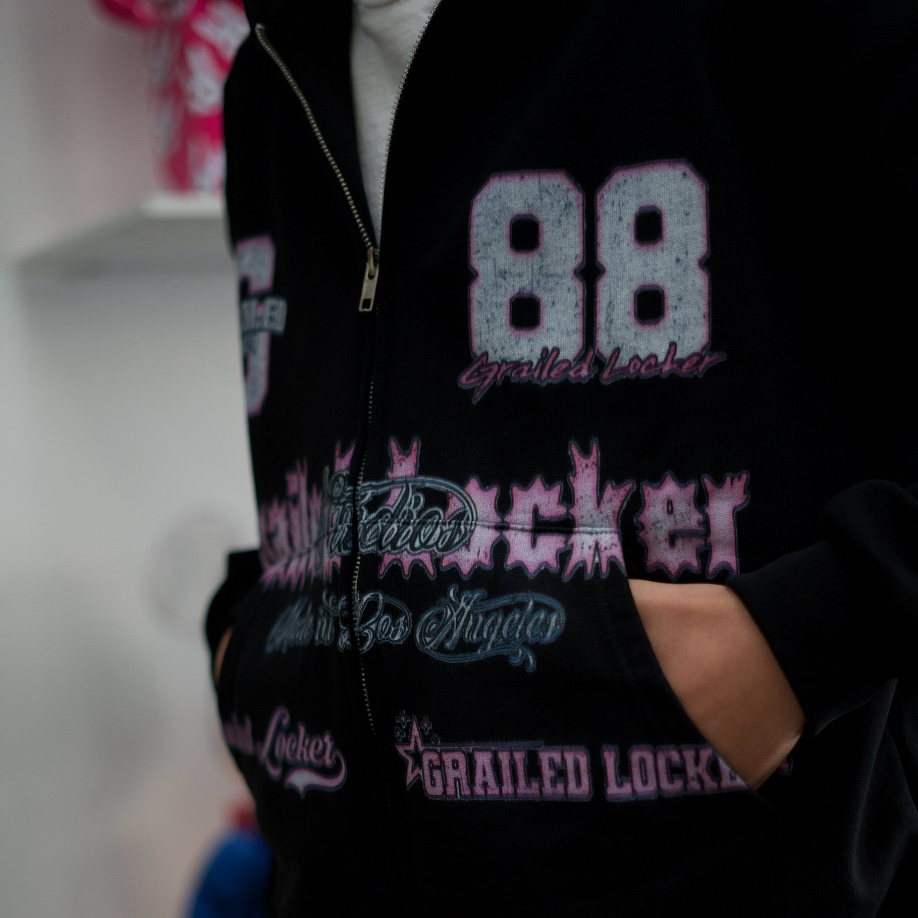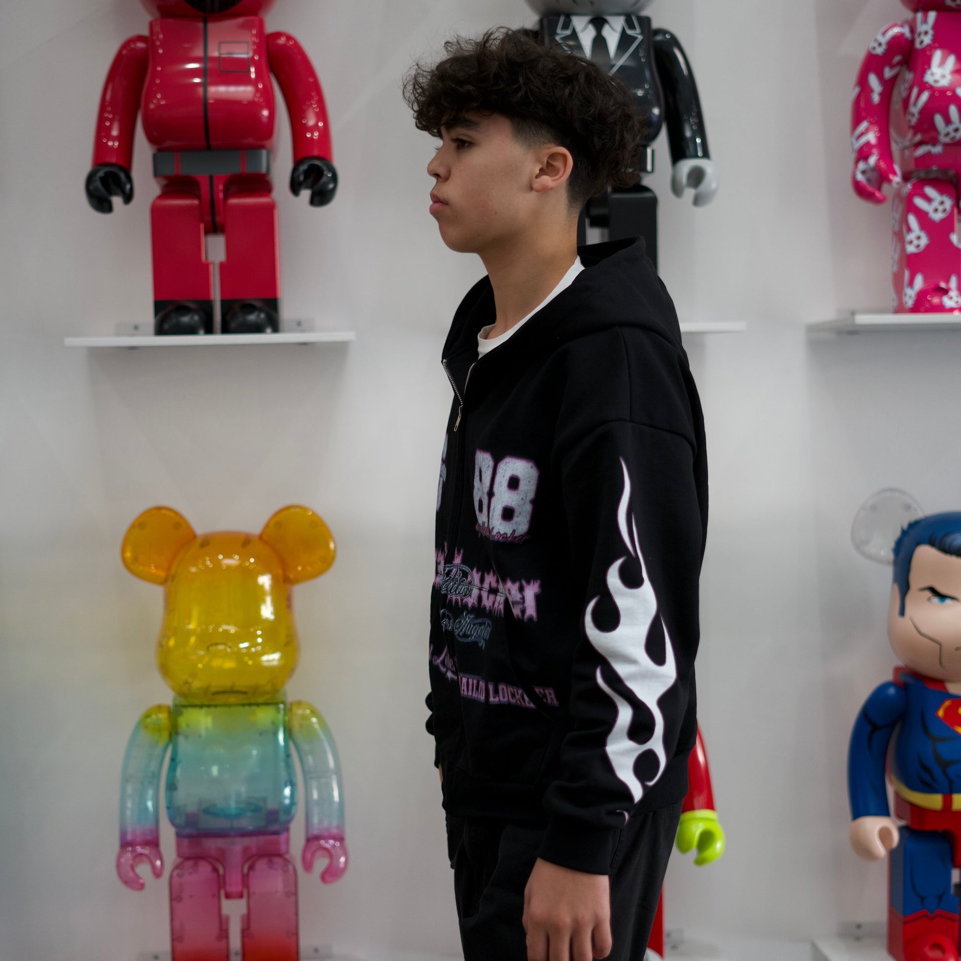This Black zip-through hoodie made from soft French terry is both comfortable and refined, making it ideal for everyday use. The hoodie also features a unique direct to garment printing on the front and sleeves of the hoodie.