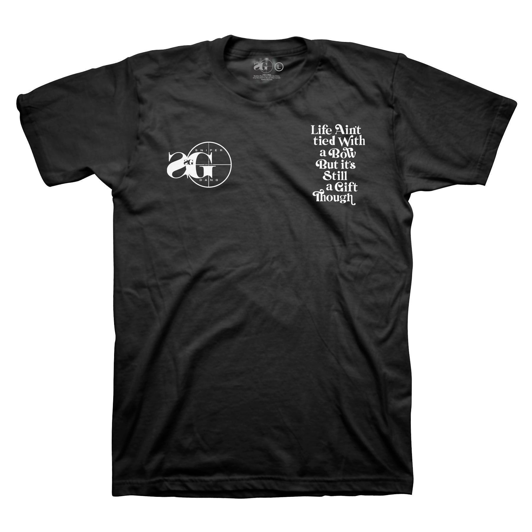 Real talk stitched into every thread. The Sniper Gang “Still a Gift” Tee keeps it solid with the classic Sniper Gang logo on the left chest and Kodak’s iconic quote on the right. Flip it around and the words hit harder—enlarged across the back as a reminder to appreciate the struggle, not just the shine.