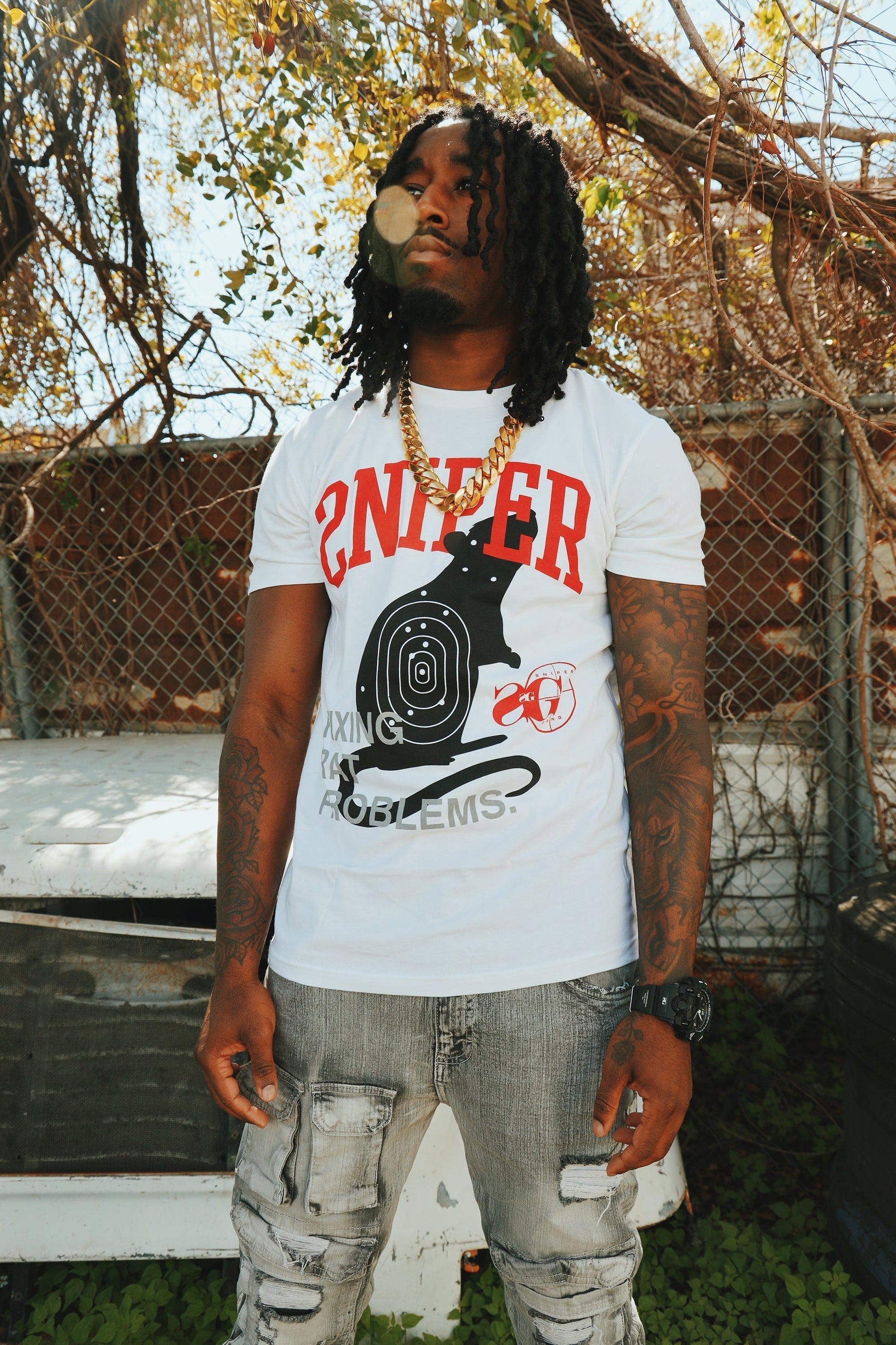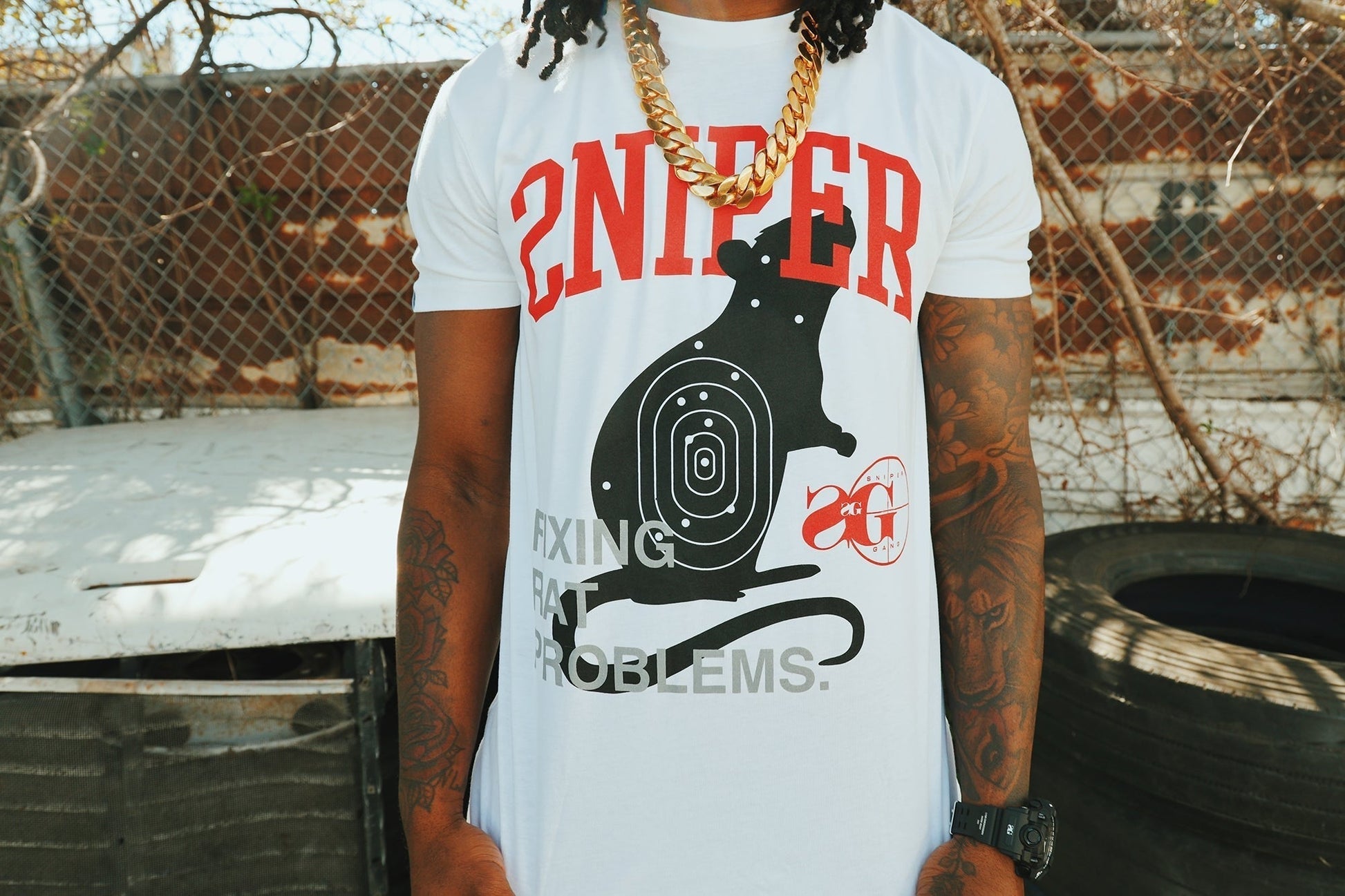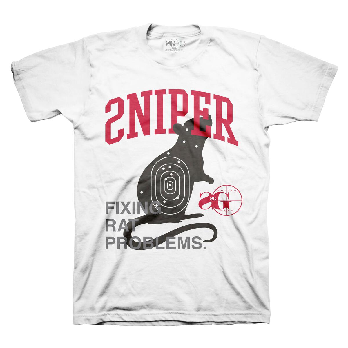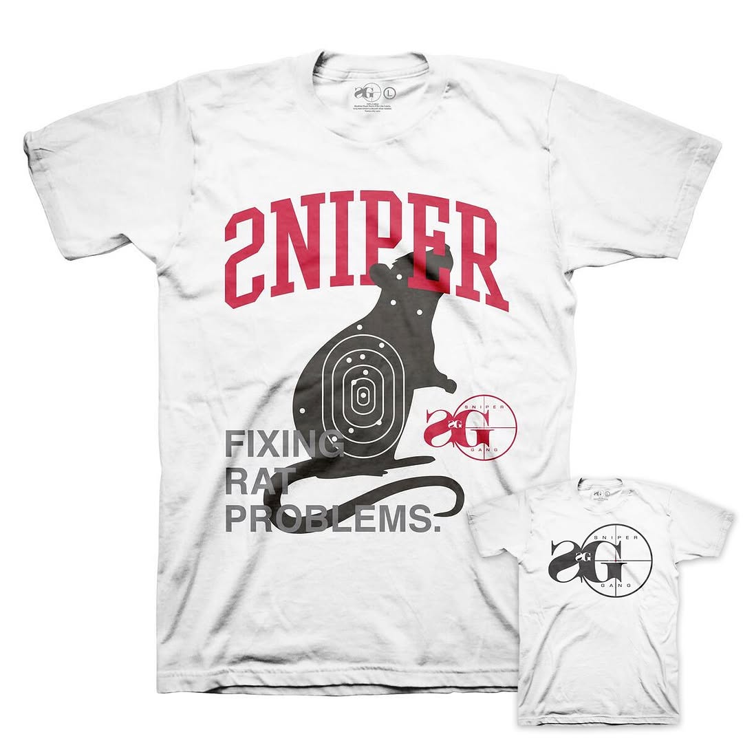 The Sniper Gang “Fixing Rat Problems” Tee sends a loud message for the streets to hear. Featuring a bold front graphic of a rat marked with a target, this tee calls out disloyalty with no filter. The phrase “Fixing Rat Problems” says it all—clean, cold, and calculated. The Sniper Gang logo hits the back, letting it be known where you stand.