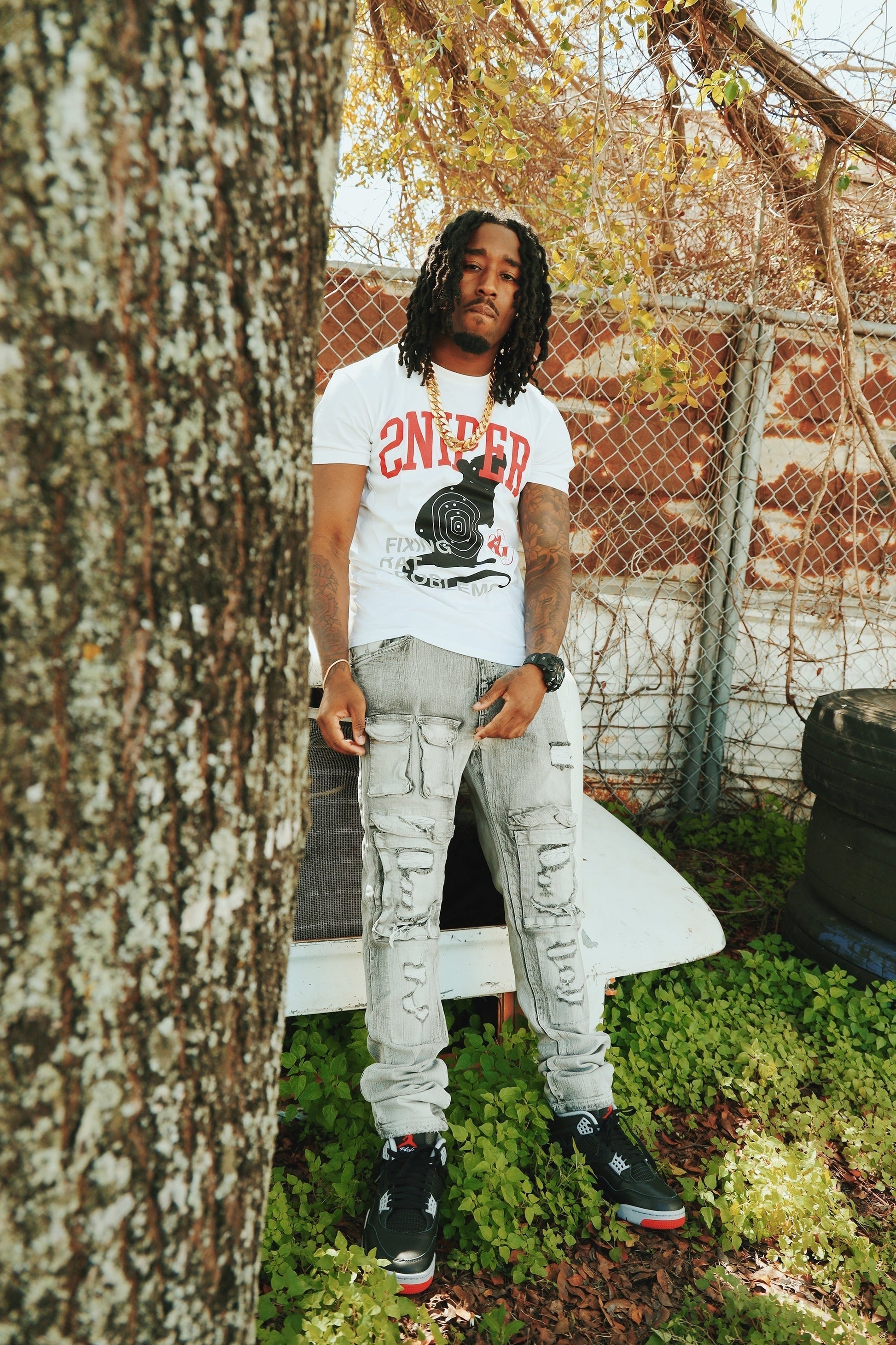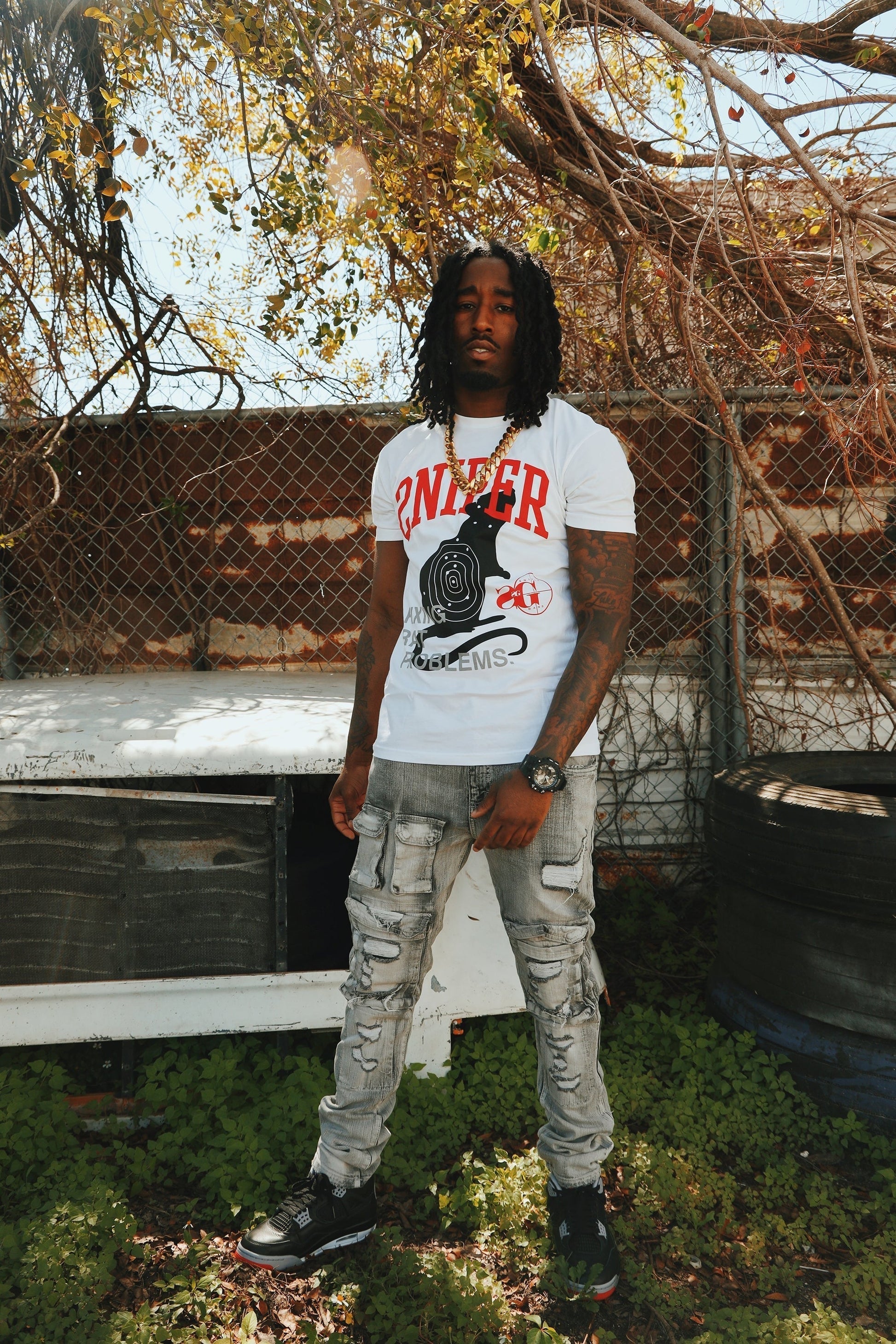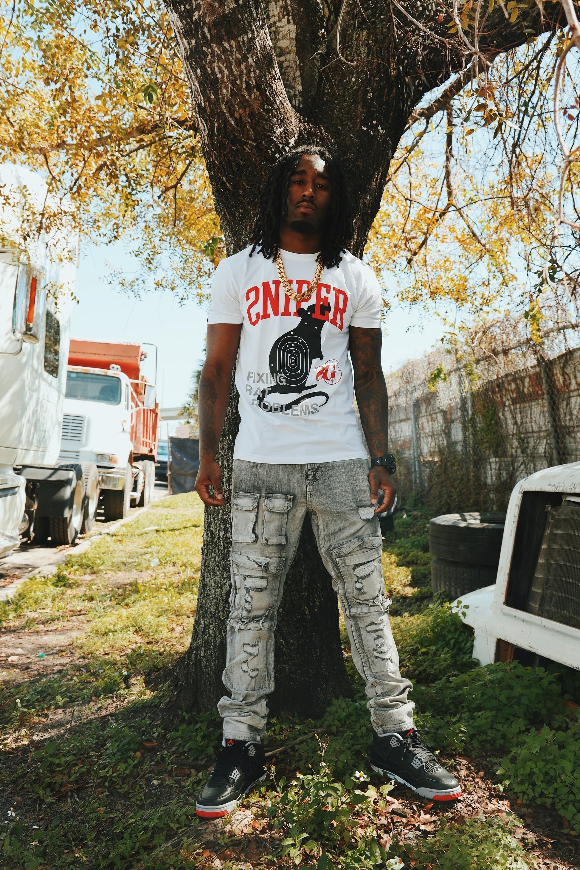 The Sniper Gang “Fixing Rat Problems” Tee sends a loud message for the streets to hear. Featuring a bold front graphic of a rat marked with a target, this tee calls out disloyalty with no filter. The phrase “Fixing Rat Problems” says it all—clean, cold, and calculated. The Sniper Gang logo hits the back, letting it be known where you stand.